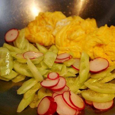 2. 把炒好的鸡蛋倒回锅中,与瓜块一起翻炒均匀。